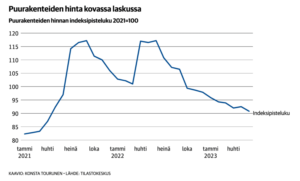 Vielä viime vuoden keväällä oli puurakentamisen hintatrendi täysin toisenlainen. Esimerkiksi huhtikuussa 2022 puurakenteet maksoivat peräti 34,5 prosenttia enemmän kuin vuotta aiemmin.